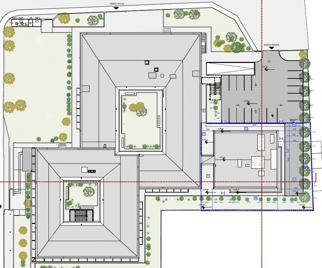 Il fabbricato di nuova realizzazione sorge nell’area adiacente al nuovo istituto Einaudi Scarpa , precisamente è allineato al volume a due piani ed è collegato allo stesso ad entrambi i piani, è previsto anche un collegamento in copertura per accessibilità agli impianti.